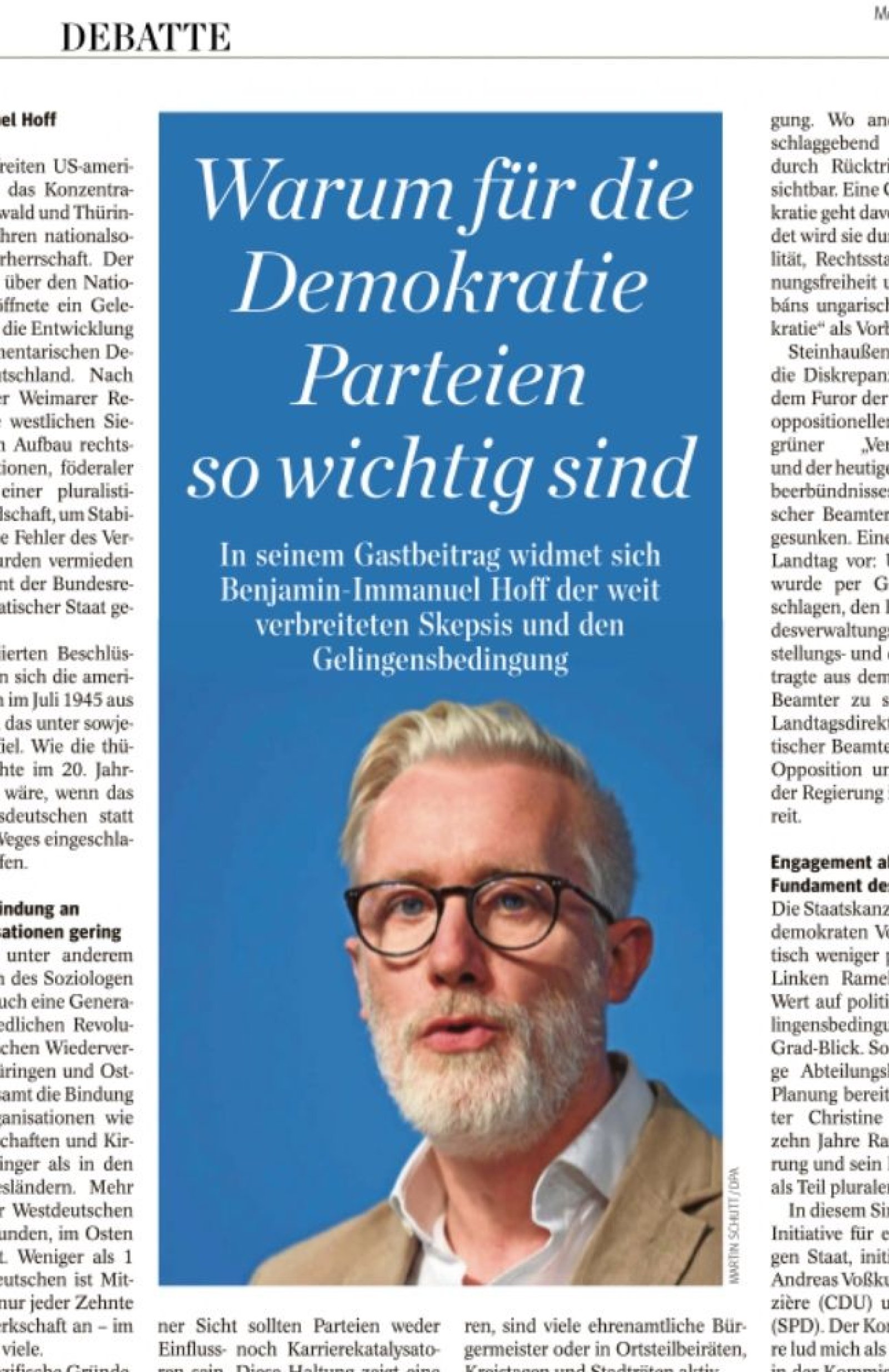 Parteien sind in unserer Demokratie keine Nebensache, sondern eine tragende Säule. Ohne sie wäre ein funktionierendes Regierungssystem nicht möglich. Parteien organisieren politische Vielfalt und füllen Strukturen mit Leben. Sie stellen durch Wahlen die Regierung, kontrollieren sie über die Opposition, sind an der Regierungsbildung beteiligt und üben Kontrollfunktionen aus. Dazu gehört auch die Auswahl von Führungspersonal, indem sie Kandidaten für Ämter rekrutieren und aufstellen – bis in die Gemeinden. Von den rund 800.000 Thüringern, die sich zivilgesellschaftlich engagieren, sind viele ehrenamtliche Bürgermeister oder in Ortsteilbeiräten, Kreistagen und Stadträten aktiv. Diese Aufgabe, die Steinhaußer „Ämterpatronage“ nennt, ist Demokratiearbeit. Ich wäre froh, wenn sich mehr Menschen nicht nur in Parteien engagieren, sondern auch für Ämter kandidieren würden. Der Vorwurf des Karrierismus trifft ungerechterweise jene, die neben Beruf, Familie und weiterem Engagement dafür sorgen, dass Ämter besetzt statt unbesetzt bleiben.