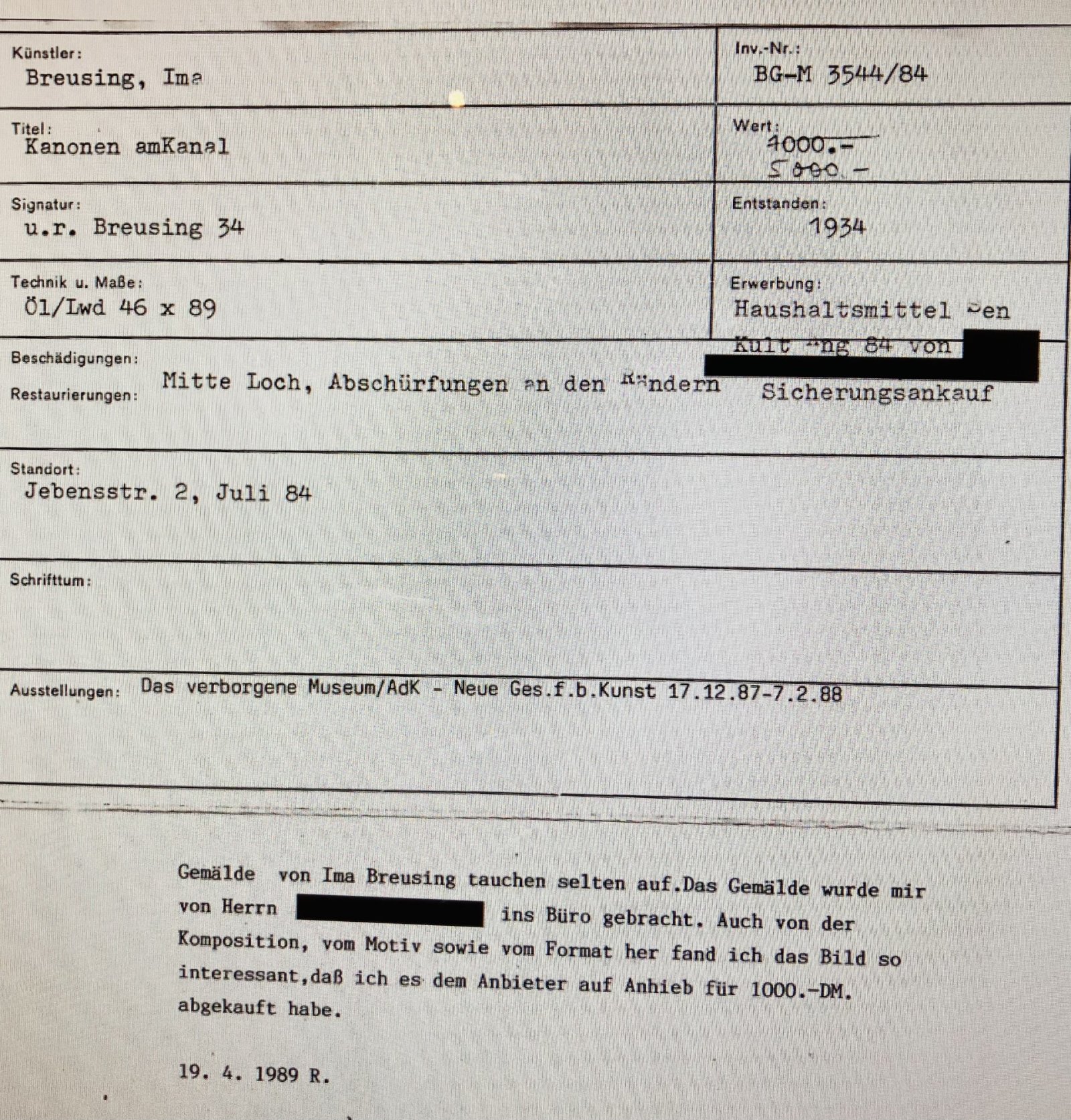 Umso wünschenswerter wäre es, wenn der digitale Teil der Ausstellung, der gegenwärtig abrufbar ist, auch nach Beendigung der Ausstellung öffentlich zugänglich und abrufbar wäre. Kulturelle Bildung ist so wichtig und was die Berlinische Galerie in den Medienstationen zusammengetragen hat, ist ohne Übertreibung Goldstaub kultureller Bildung. Nehmen wir nur das Werk „Kanonen am Kanal“ von Ima Breusing aus dem Jahre 1934. Das Gemälde im ungewöhnlichen Format eines sehr lang gezogenen Rechtsecks zeigt fünf lachsfarbene Kanonen vor Fabrik- oder Lagerhallen. Neben Informationen über die Bauhaus-Schülerin Breusing, die 1924 nach Berlin kam, erläutert das Museum in Dokumenten den Ankauf und Hintergrund des Gemäldes – führt behutsam und nachvollziehbar in die unterschiedlichen Betrachtungsebenen der Provinienzforschung ein.