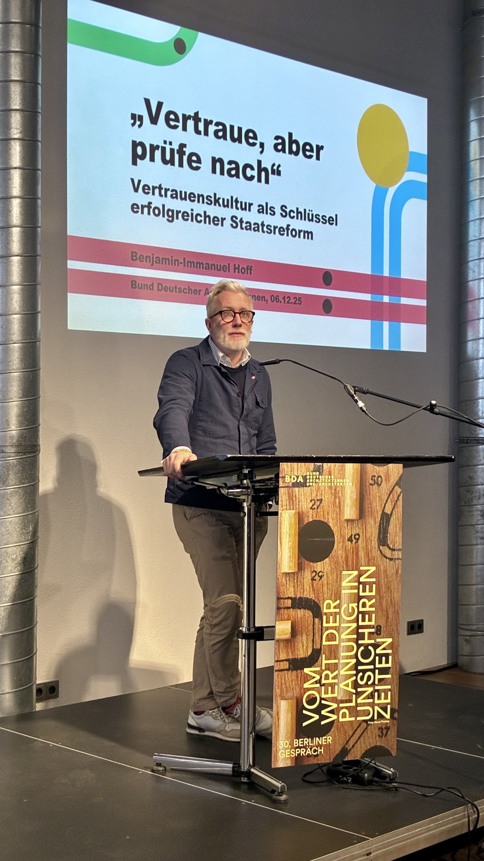 Das diesjährige 30. Berliner Gespräch des Bundes Deutscher Architektinnen und Architekten fragte unter der Überschrift: "Vom Wert der Planung in unsicheren Zeiten" nach dem Wert der Planung und den dafür notwendigen Rahmenbedingungen in Zeiten, in denen demokratische Grundwerte zunehmend unter Druck geraten.